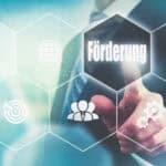 A businessman pressing a Promotion "Förderung" button in German on a futuristic computer display