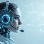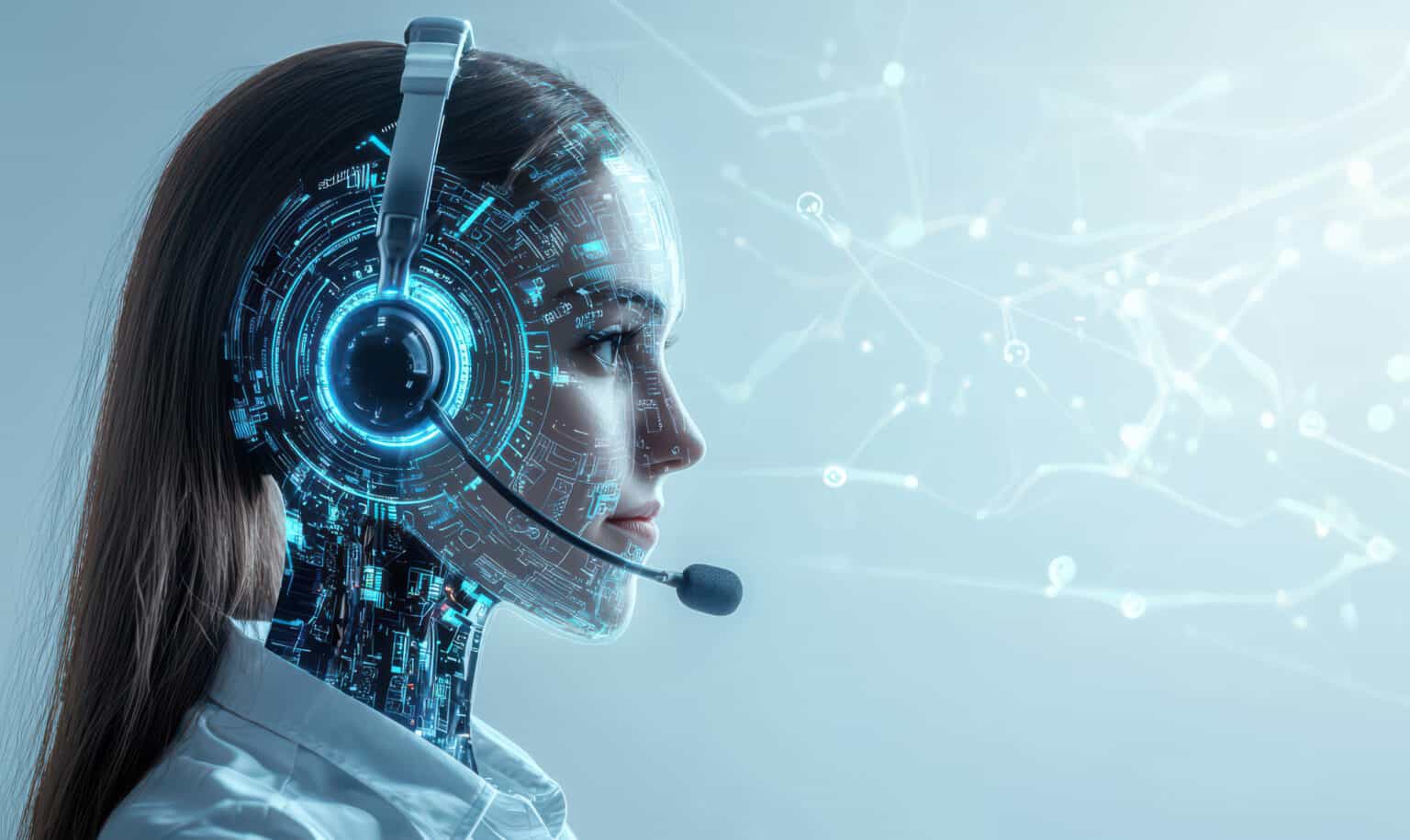 Futuristic woman with a digital headset, blending technology and human interaction, symbolizing innovation in communication, ai call center concept